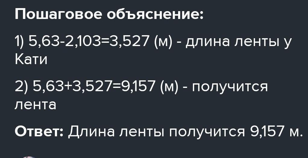 У Лилии лента длиной 5,63 м, а у Кати на 2,103 м меньше. Если сшить две ленты, то какой длины она получится?