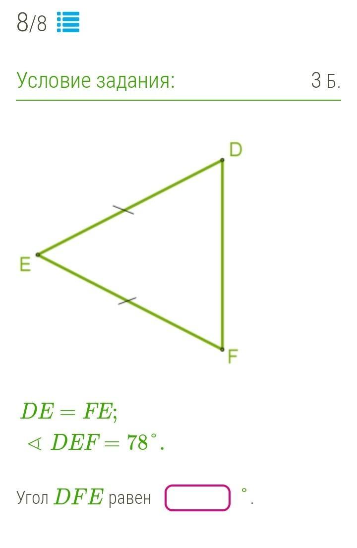 угол DFE = углу DEF = 78 градусов