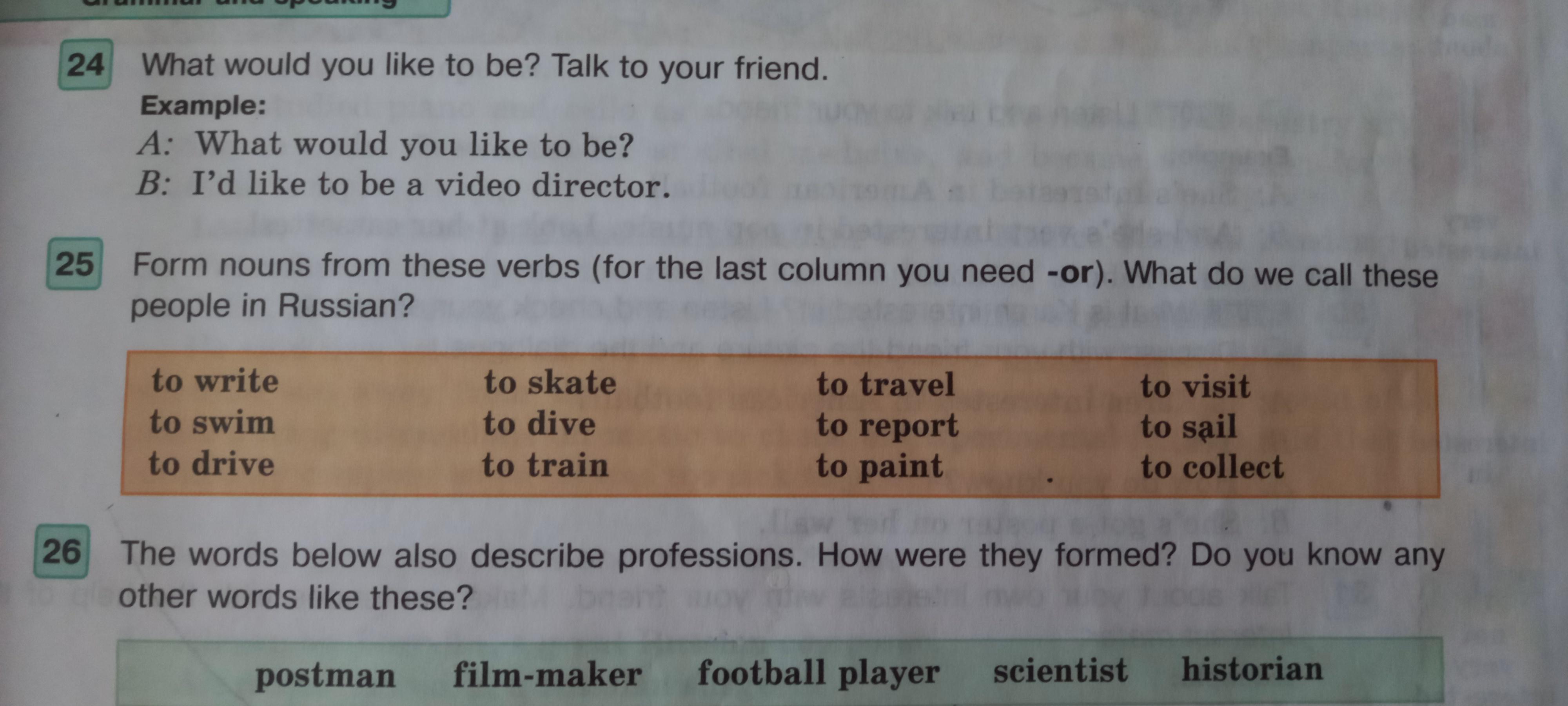 Помогите пожалуйста с английским! Задание №25. Form nouns from these verbs (for the last column you need -or). What do we call these people in Russian?