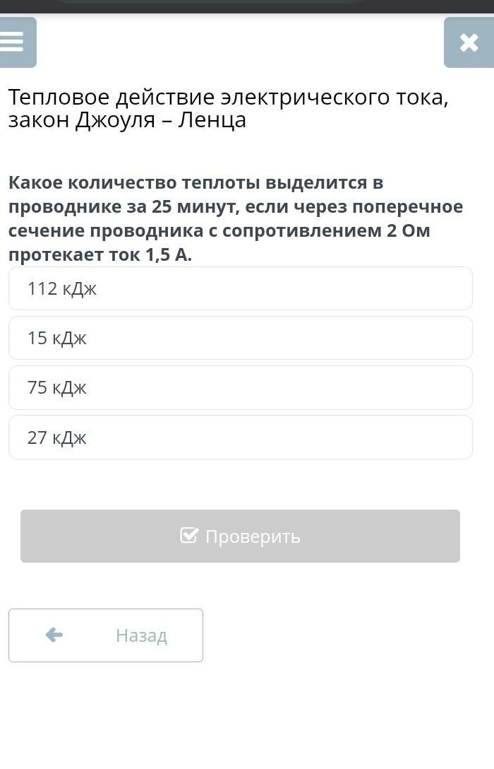 Тепловое действие электрического тока, закон джоуля - ленца какое количество теплоты выделится в проводнике за 25 минут, если через поперечное сечение проводника с сопротивлением 2 ом протекает ток 1,5 а. 112 кдж 15 кдж 75 кдж 27 кдж