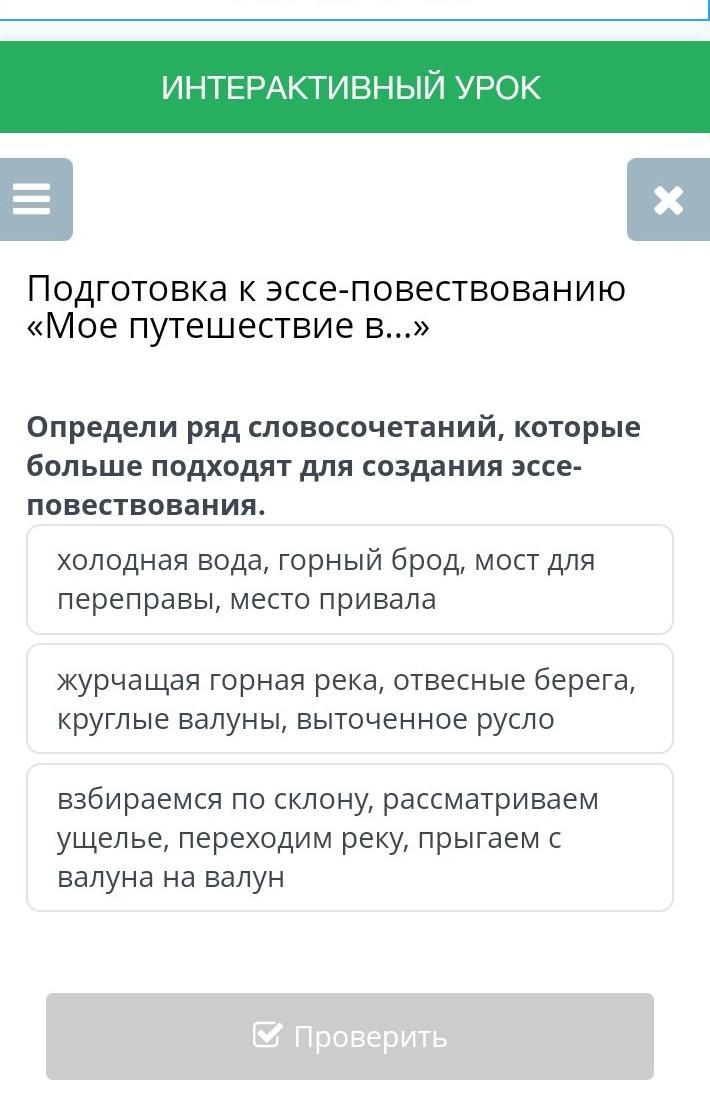 Подготовка к эссе-повествованию «Мое путешествие в...» Определи ряд словосочетаний, которые больше подходят для создания эссе- повествования. холодная вода, горный брод, мост для переправы, место привала журчащая горная река, отвесные берега, круглые валуны, выточенное русло взбираемся по склону, рассматриваем ущелье, переходим реку, прыгаем с валуна на валун