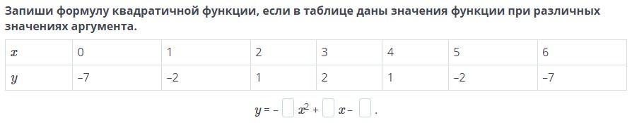 Запиши формулу квадратичной функции, если в таблице даны значения функции при различных значениях аргумента.