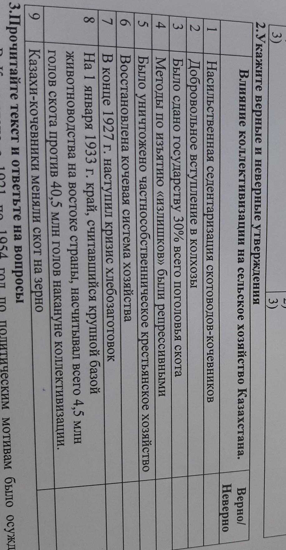 Укажите верные и неверные утверждения Влияние коллективизации на сельское хозяйство Казахстана. Верно/ Неверно 1 1 2 3 4 5 6 7 8 Насильственная седентаризация скотоводов-кочевников Добровольное вступление в колхозы Было сдано государству 30% всего поголовья скота Методы по изъятию «излишков» были репрессивными Было уничтожено частнособственническое крестьянское хозяйство Восстановлена кочевая система хозяйства В конце 1927 г. наступил кризис хлебозаготовок На 1 января 1933 г. край, считавшийся крупной базой животноводства на востоке страны, насчитывал всего 4,5 млн голов скота против 40,5 млн голов накануне коллективизации. Казахи-кочевники меняли скот на зерно 9 Плото од тогалт я отратите во ропполь
