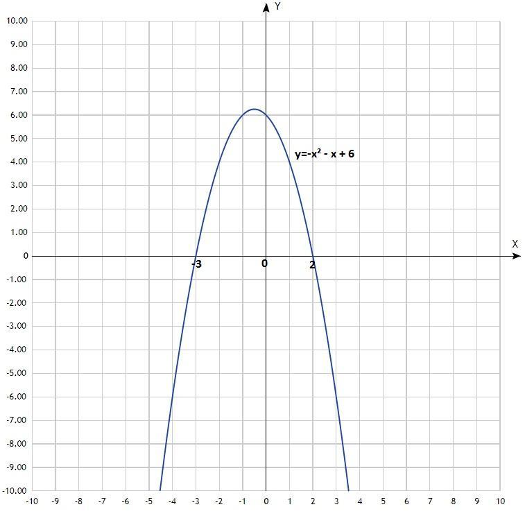 Уравнение квадратичной функции, график - парабола, ветви направлены вниз, пересекают ось Ох в точках х = -3 и х = 2.