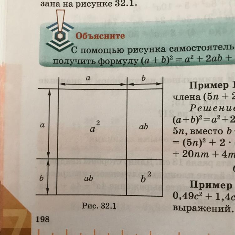 С помощью рисунка самостоятельно объясните,как можно получить формулу (a+b)^2=a^2*2ab+b^2 ?