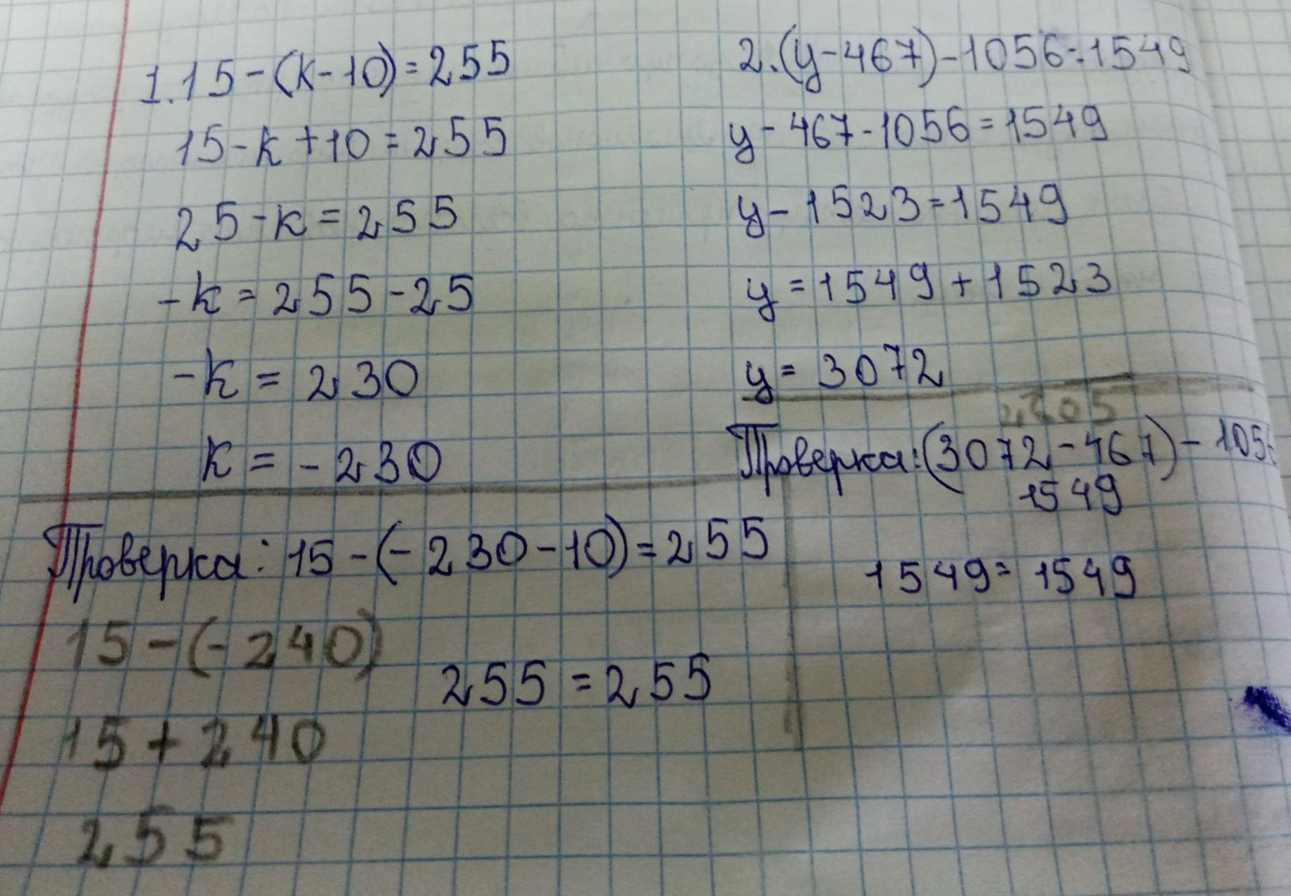 8 Реши уравнения. 15 - (k - 10) = 255. (у- 476) - 1 056 = 1 549 ПЖ ТОЛЬКО ПРАВИЛЬНО и с проверкой