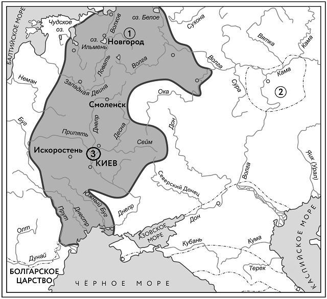 Около места, обозначенного на карте цифрой «1», проживали ильменские словене — один из восточнославянских племенных союзов. На территории Среднего Поднепровья, обозначенной на карте цифрой «3», обитали поляне, столицей которых был город Киев. На месте, обозначенном цифрой «2», находилось сильное государство — Волжская Булгария.