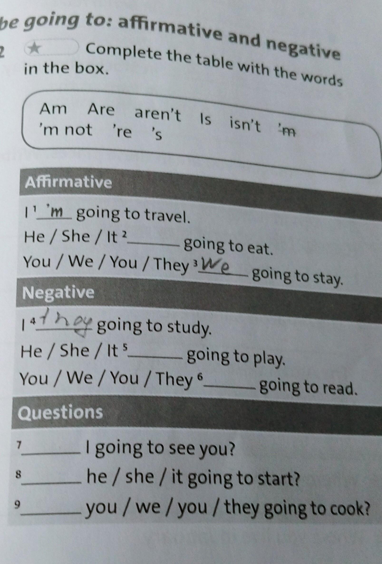be going to: affirmative and negative Complete the table with the words 2 in the box. Am Are 'm not 're aren't Is isn't 'm 's Affirmative I'm going to travel. He/She / It? going to eat. You / We / You / They? We going to stay Negative 147 hou going to study. He/She / It going to play You / We / You / They 6 going to read. Questions I going to see you? he/she/it going to start? you / we/you/ they going to cook? 6 7 8 00 9