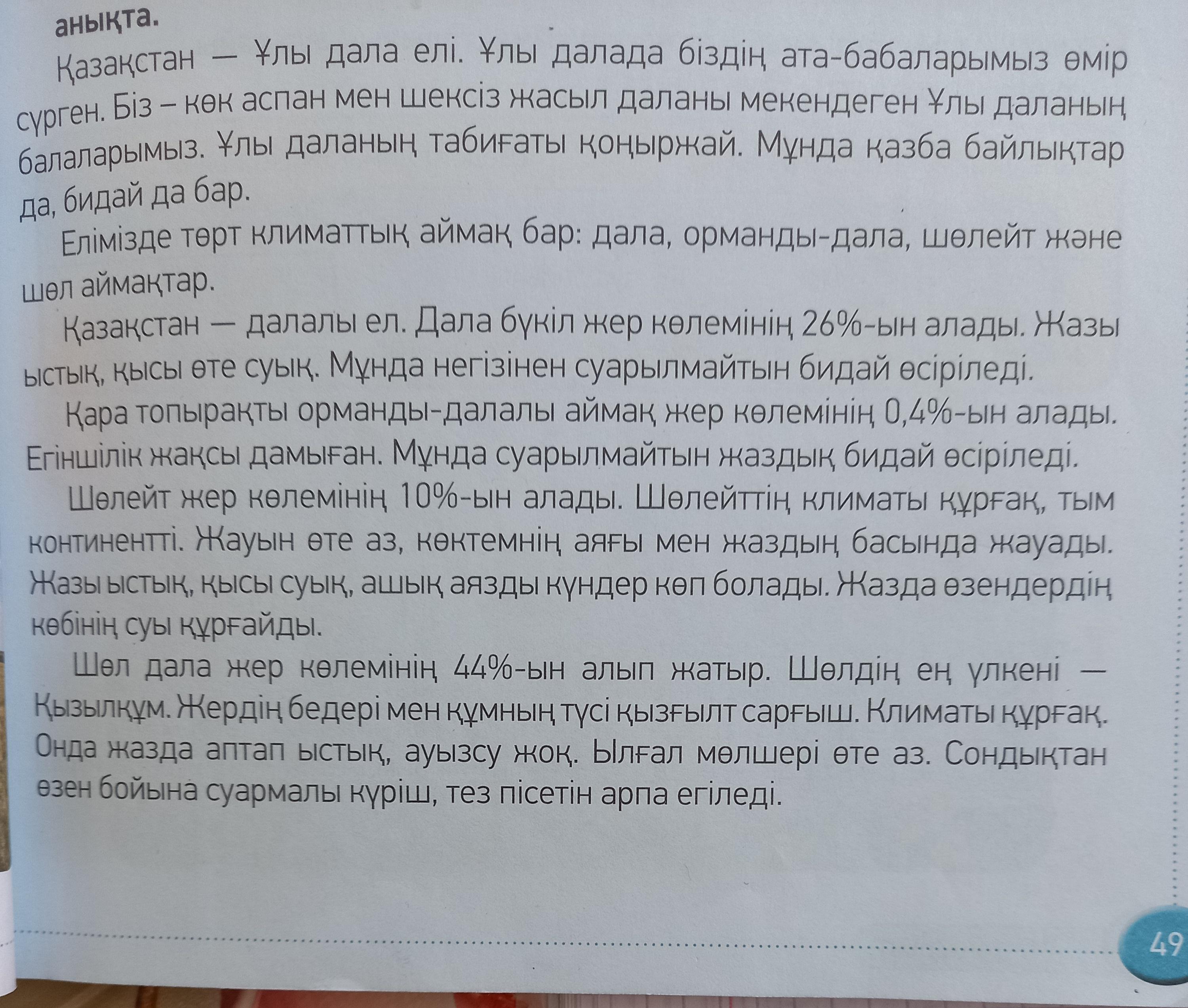 определять. Казахстан – страна великих степей. Наши предки жили в великой степи. Мы дети Великой Степи, населяющие синее небо и бескрайнюю зеленую степь. Природа Великой Степи умеренная. Есть и минералы, и пшеница. В стране четыре климатические зоны: степная, лесостепная, пустынная и пустынная. Казахстан – степная страна. Степь занимает 26% всей площади суши. Лето жаркое, а зима очень холодная. В основном здесь выращивают неорошаемую пшеницу. Лесостепная зона с черноземом занимает 0,4% площади суши. Хорошо развито сельское хозяйство. Здесь выращивают неорошаемую яровую пшеницу. Шелейт занимает 10% площади суши. Климат Шелейта сухой и резко континентальный. Осадков мало, в конце весны и в начале лета. Лето жаркое, зима холодная, бывают ясные морозные дни. Летом вода пересыхает. Степь занимает 44% площади суши. Крупнейший Шелл = Кызылкум. Рельеф и песок оранжевого цвета. Климат сухой. Летом жарко и нет питьевой воды. Влажность очень низкая. Поэтому вдоль реки высаживают орошаемый рис и скороспелый ячмень. 49