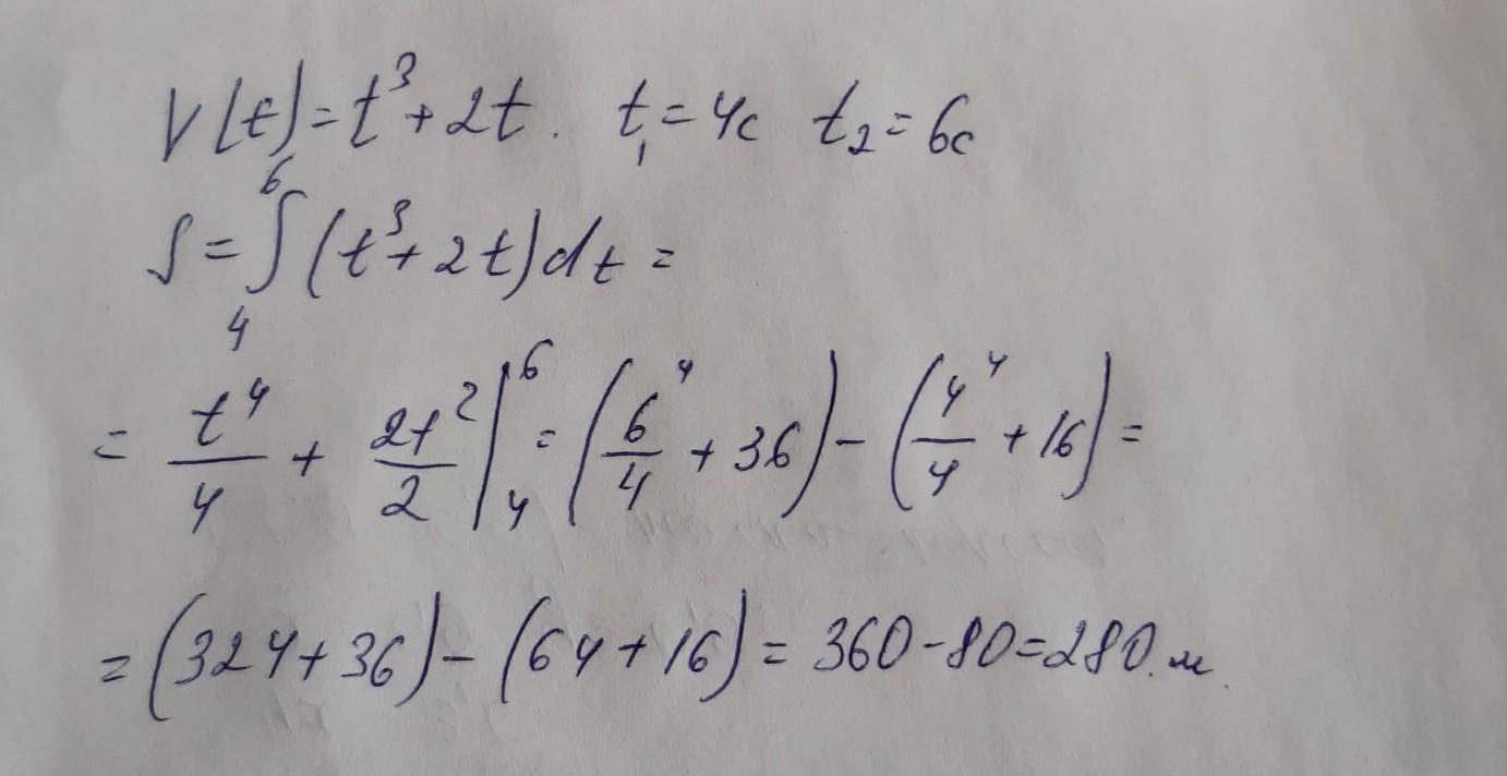 Тело движется прямолинейно со скоростью v(t)=t^3+2t (м/с). Найдите путь, пройденный телом за промежуток времени от t = 4 с до t = 6 с.