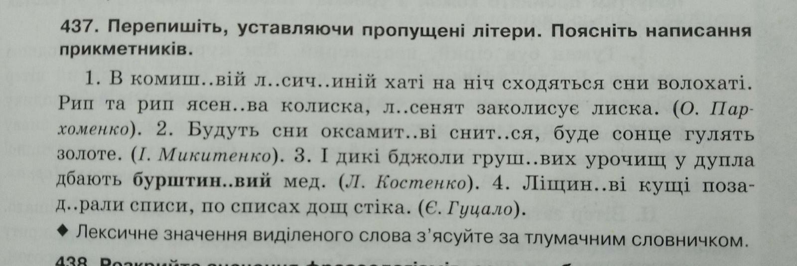 1 комишевій, лисиччиній. ясенева, лисенят. 2 оксамитові, сниться. 3 грушевих, бурштиновий. 4 ліщинові, позадирали