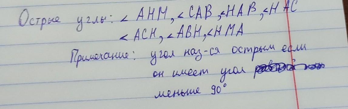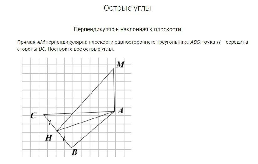 Задание: Прямая AM перпендикулярна плоскости равностороннего треугольника ABC, точка H середина стороны BC. Нарисуйте на картинке все острые углы.
