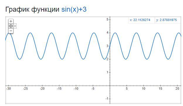 График функции y = sin x + 3 получается из графика функции y = sin x сдвигом на 3 единичных отрезка вверх.