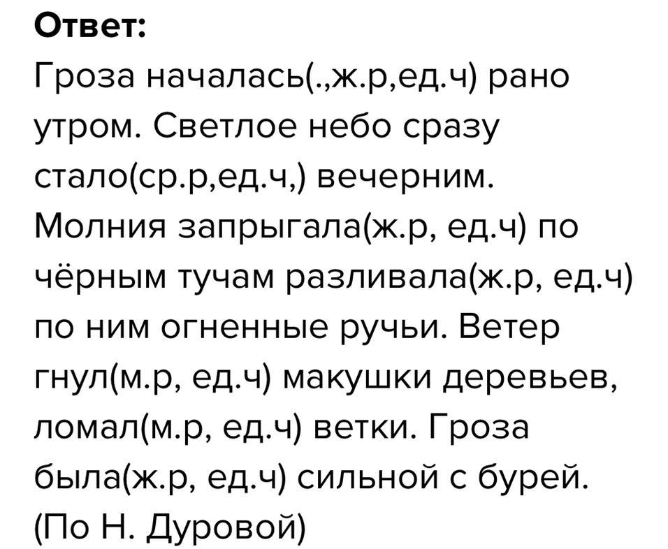 Гроза началась рано утром. Светлое небо сразу стали вечерним. Молния запрыгали по чёрным тучам, разливала по ним огненные ручьи. Ветер гнули макушки деревьев, ломал ветки. Гроза была сильной, с бурей. (По Н. Дуровой)