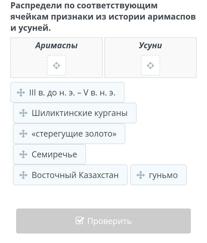 Распредели по соответствующим ячейкам признаки из истории аримаспов и усуней. Аримаспы Усуни