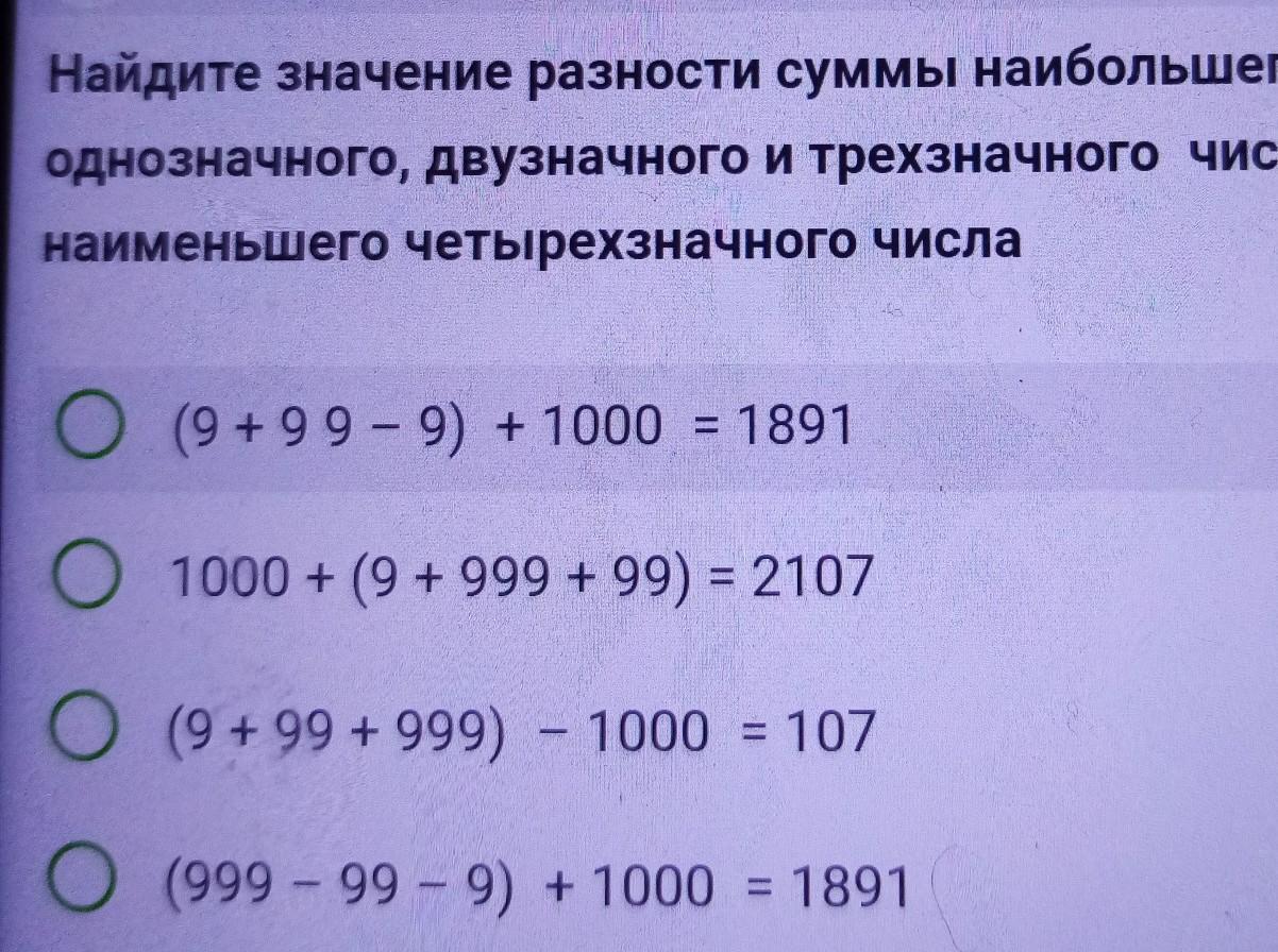 Найдите значение разности суммы наибольшего однозначного, двузначного и трехзначного чисел и наименьшего четырехзначного числа O (9 + 99 - 9) + 1000 = 1891 = O 1000 + (9 + 999 +99) = 2107 = O (9 + 99 + 999) - 1000 = 107 O (999 - 99 - 9) + 1000 = 1891Найди значение разности суммы наибольшего двузначного на двузначное и трёхзначное числа и наименьшего четырёхзначного числа
