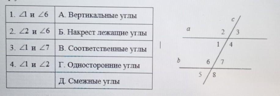3. Установите соответствие между элементами первого и второго столбцов. На рисунке параллельные прямые а и b пересечены секущей с. Определите вид указанных пар углов.