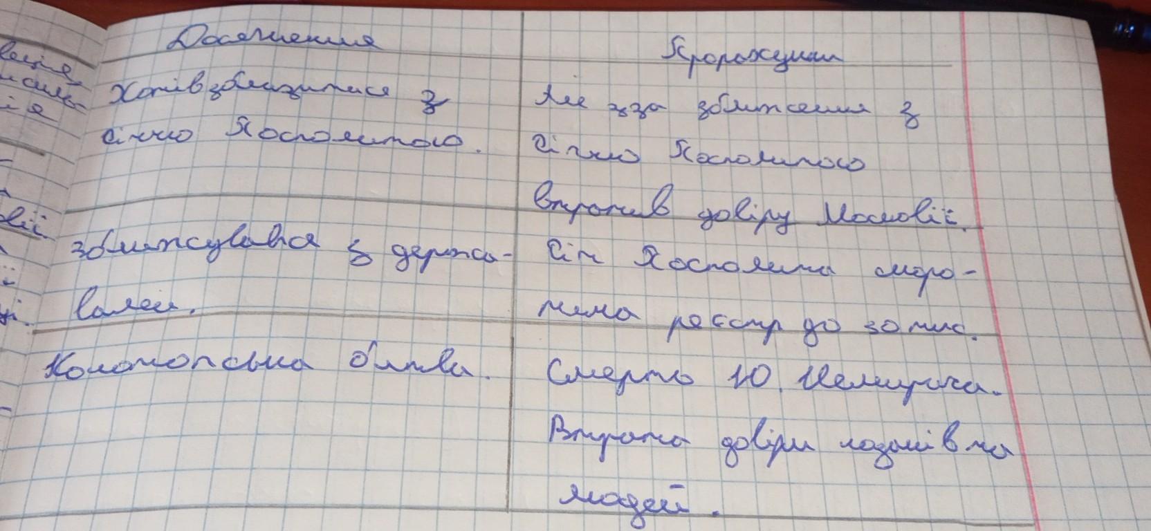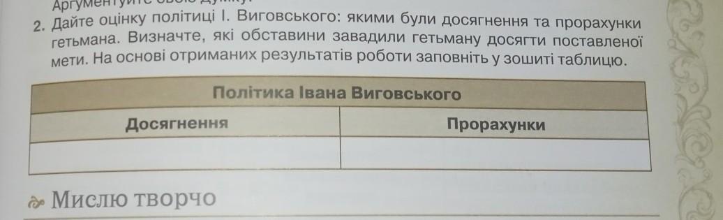 Дайте оцінку політиці 1. Виговського: якими були досягнення та прорахунки гетьмана. Визначте, які обставини завадили гетьману досягти поставленої мети. На основі отриманих результатів роботи заповніть у зошиті таблицю.