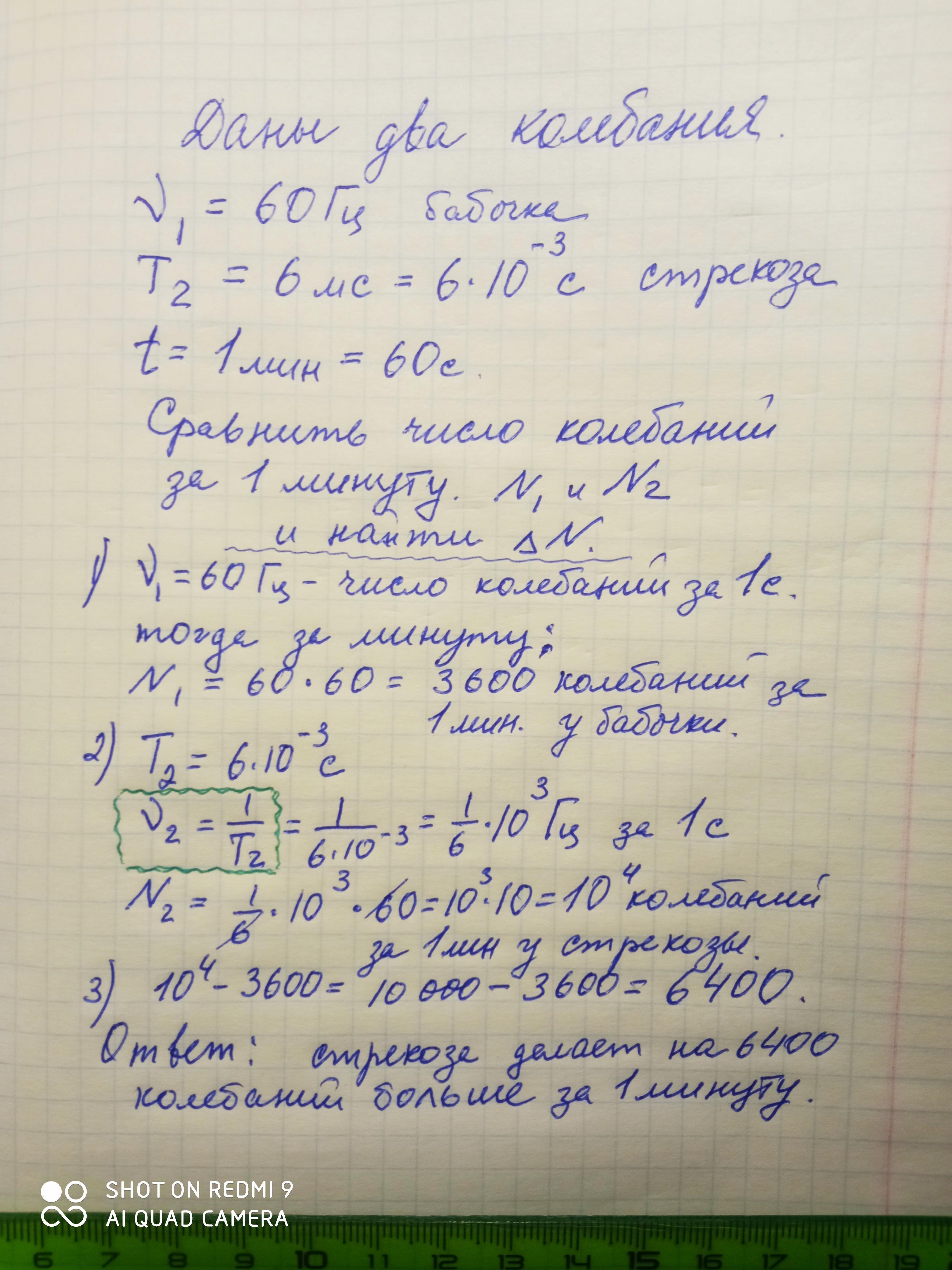 Частота колебаний крыльев бабочки равна 60 Гц, а период колебаний крыльев стрекозы равен 6 мс. Определи, какое из насекомых за 1 минуту полёта сделает больше взмахов и на сколько больше.