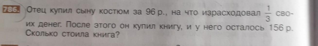 Отец купил сыну костюм за 96 рублей,на что он израсходовал 1/3 своих денег. После этого он купил книгу, и у него осталось 156 рублей.Сколько стоила книга?