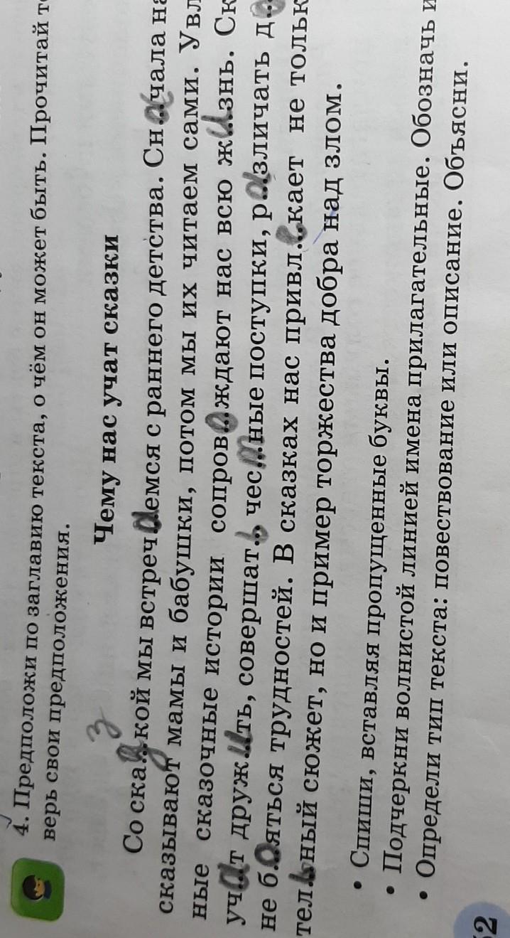 • Обозначь окончания имён прилаг 4. Предположи по заглавию текста, о чём он может быть. Прочитай текст и про- верь свои предположения. 2 Чему нас учат сказки Со скалкой мы встречаемся с раннего детства. Сначала нам их рас- сказывают мамы и бабушки, потом мы их читаем сами. Увлекатель- ные сказочные истории сопровождают нас всю жезнь. Сказки на учт дружJть, совершат., чесные поступки, р.2/зличать добро и зло, не бояться трудностей. В сказках нас привл.кает не только занима тел.фный сюжет, но и пример торжества добра над злом. • Спиши, вставляя пропущенные буквы. Подчеркни волнистой линией имена прилагательные. Обозначь их число. Определи тип текста: повествование или описание. Объясни.