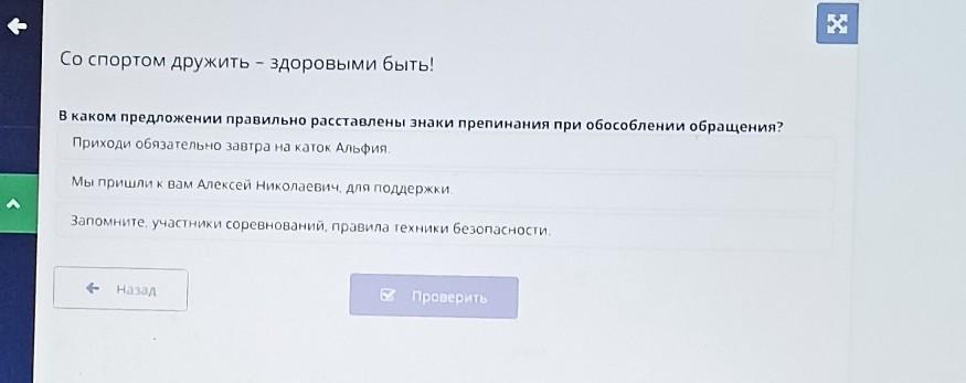 OK х Со спортом дружить - здоровыми быть! В каком предложении правильно расставлены знаки препинания при обособлении обращения? Приходи обязательно завтра на каток Альфия. Мы пришли к вам Алексей Николаевич, для поддержки. Запомните, участники соревнований, правила техники безопасности. Назад Проверить. пожалуйста