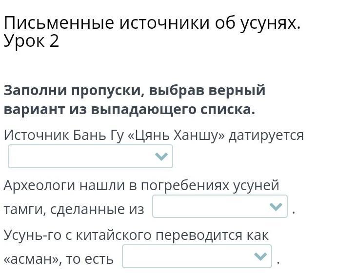 Письменные источники об усунях. Урок 2 Заполни пропуски, выбрав верный вариант из выпадающего списка. Источник Бань Гу «Цянь Ханшу» датируется Археологи нашли в погребениях усуней тамги, сделанные из . Усунь-го с китайского переводится как «асман», то есть .
