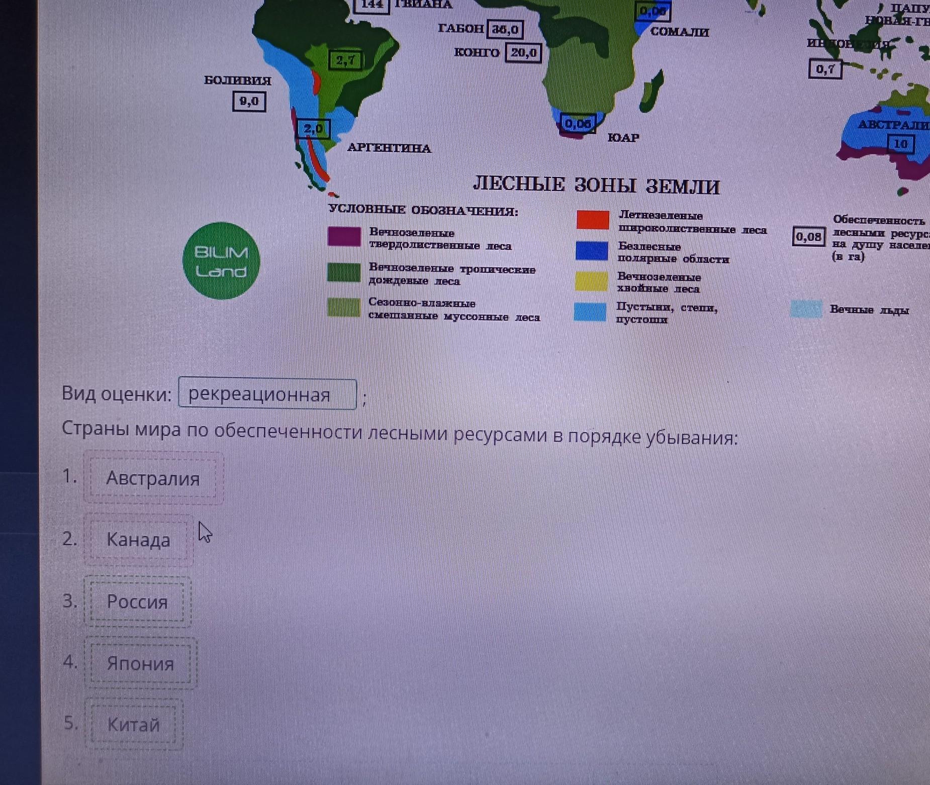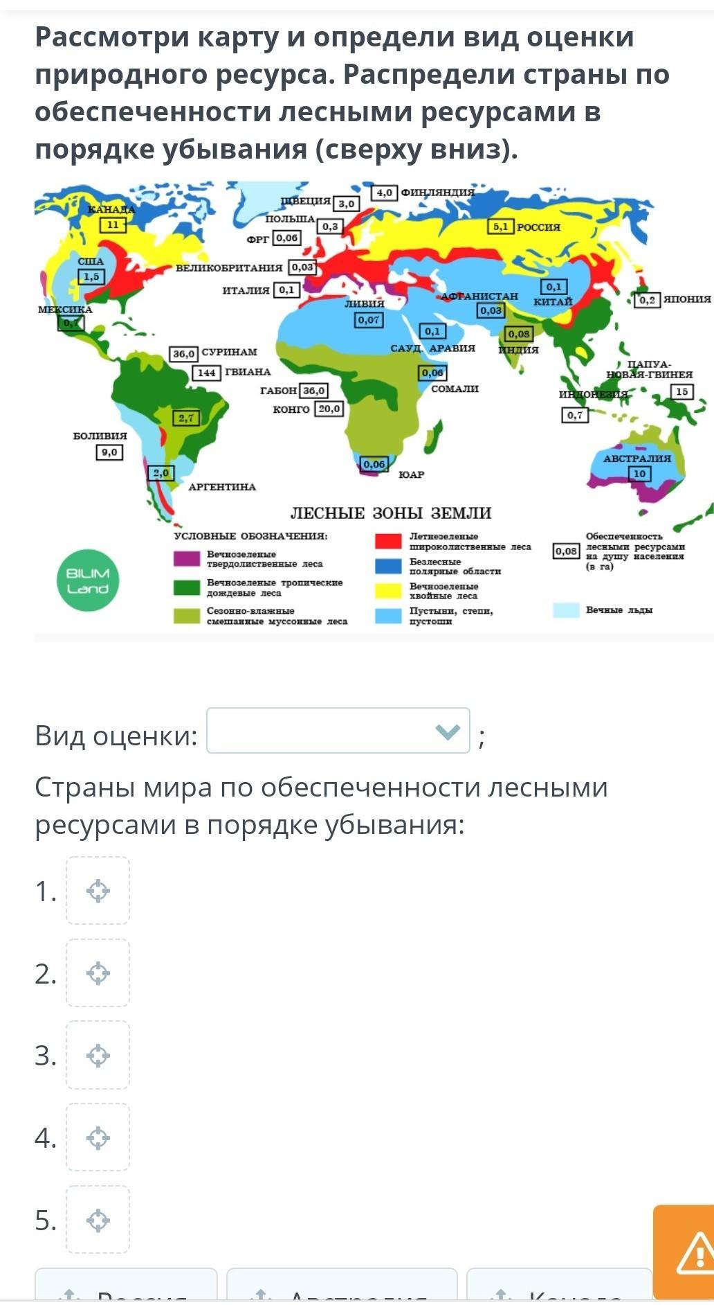 Рассмотри карту и определи вид оценки природного ресурса. Распредели страны по обеспеченности лесными ресурсами в порядке убывания (сверху вниз).
