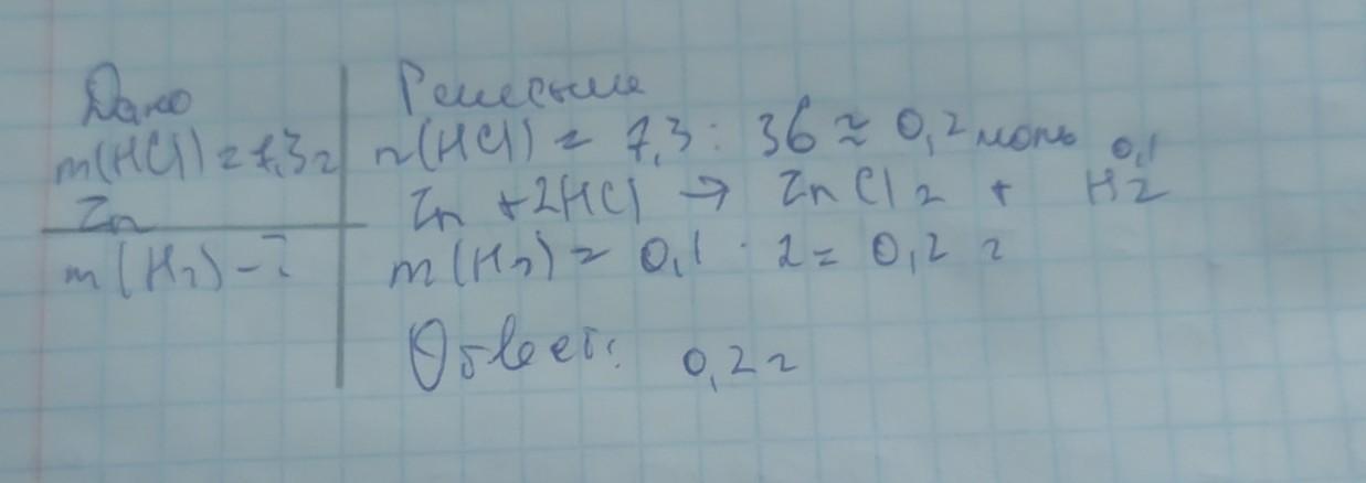 7,3грамма соляной кислоты реагируют с Zn сколько грамм водорода образовалось в ходе реакции? (Н.у)