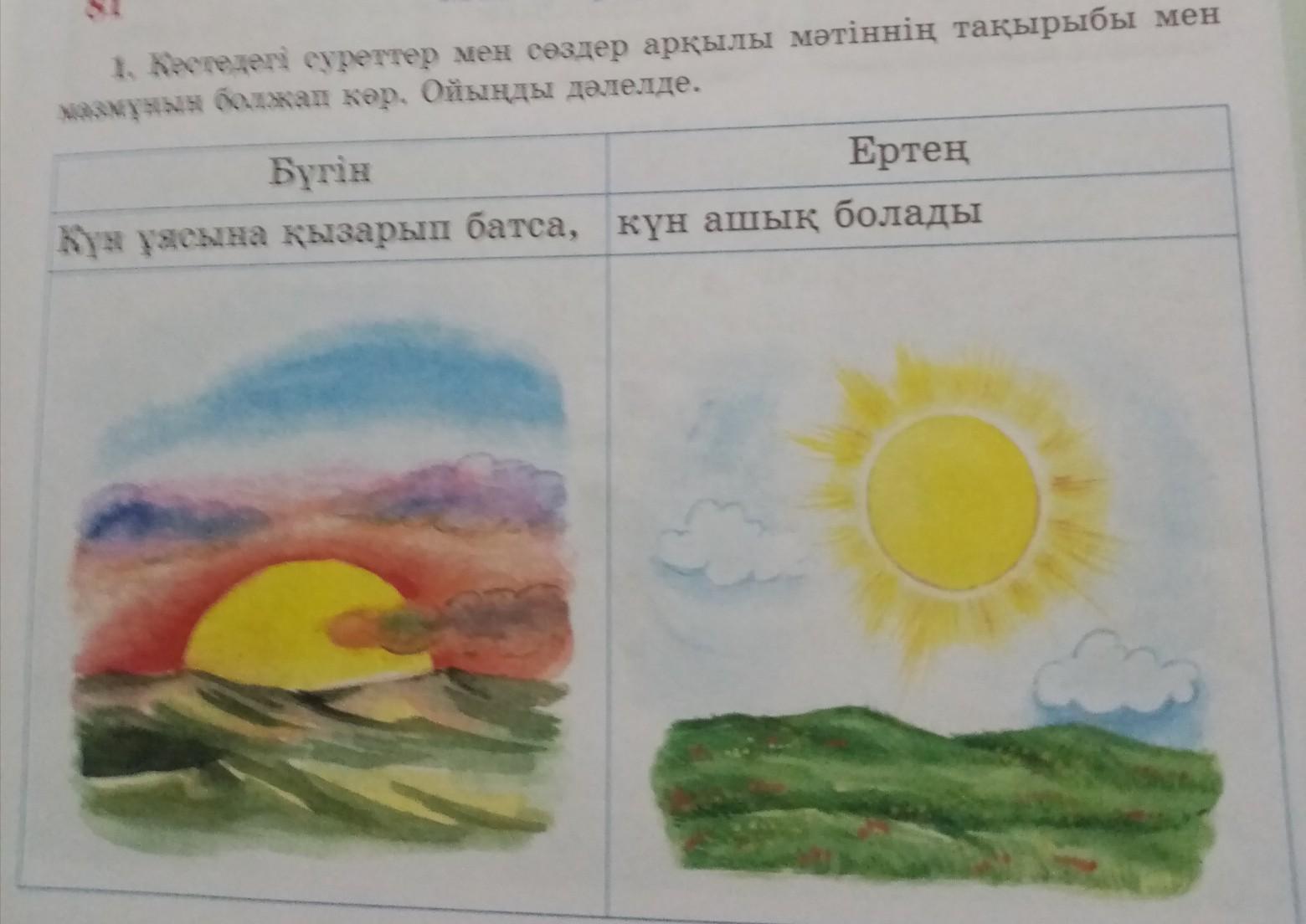 1. Кестедегі суреттер мен сөздер арқылы мәтіннің тақырыбы мен мазмұнын болжап көр. Ойыңды дәлелде, Бүгін Ертен, Күн ұясына қызарып батса, күн ашық болады