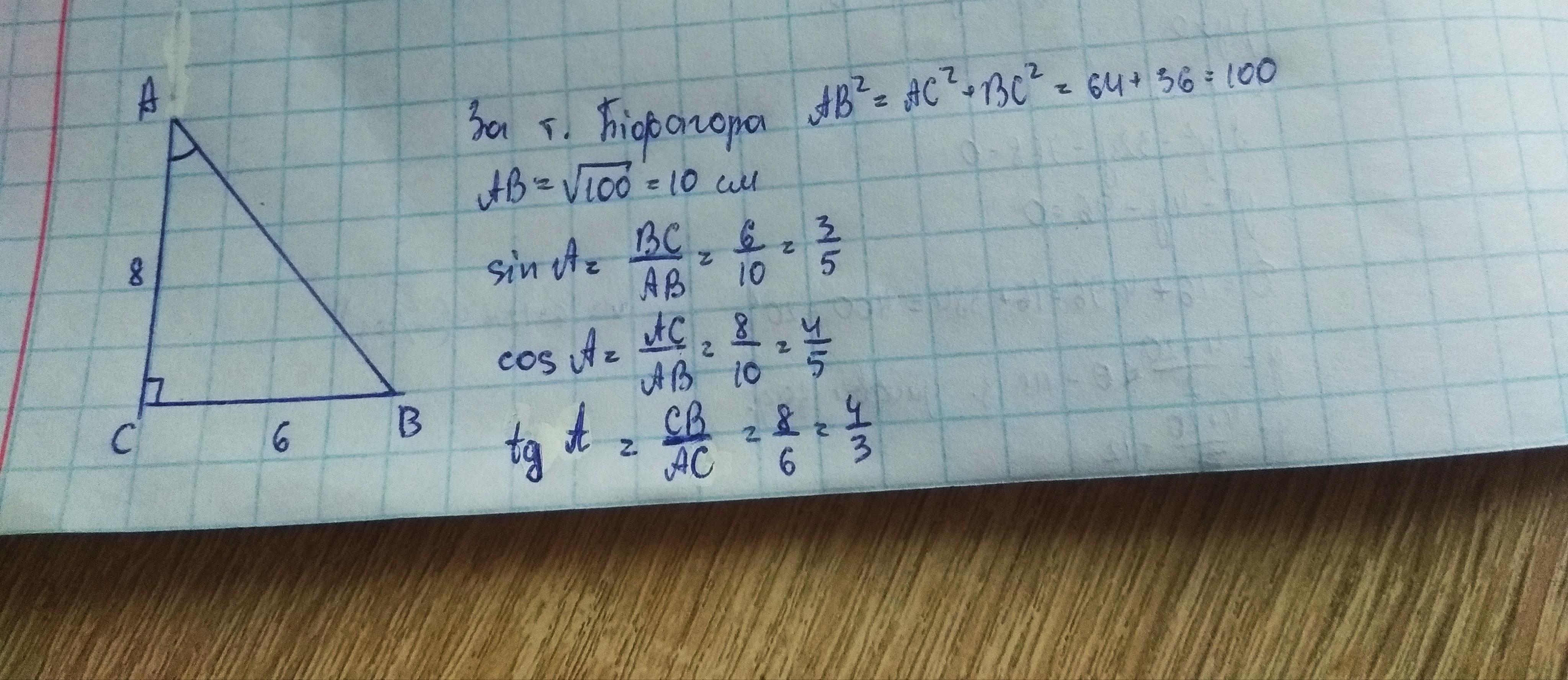 у трикутнику АВС кут С=90, АС=8см, ВС=6см. знайдіть косинус, синус і тангенс кута А