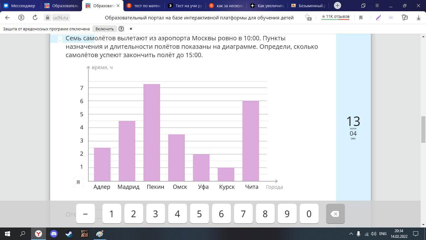 Семь самолётов вылетают из аэропорта Москвы ровно в 10:00. Пункты назначения и длительности полётов показаны на диаграмме. Определи, сколько самолётов успеют закончить полёт до 15:00.