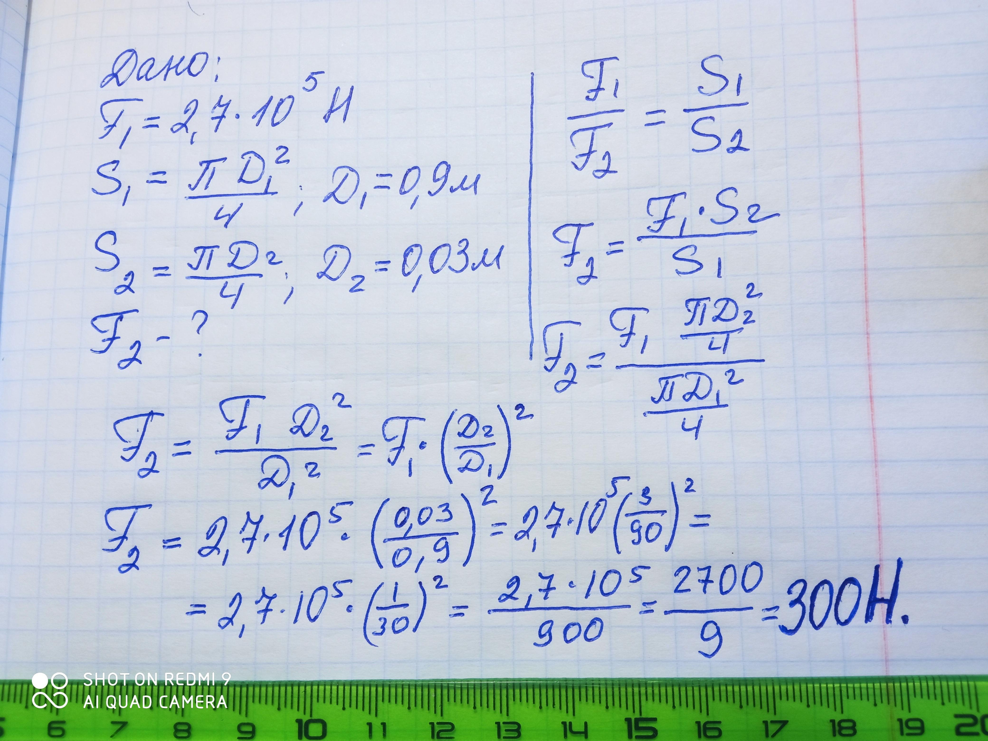 2. гидравлический пресс должен производить усилие 2,7 • 10^5 н. Диаметр малого поршня составляет З см, а большого-90 см. Младший поршеньге какие силы надо снимать?
