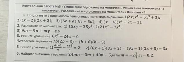 3. 6x²-24=0 6x(x-4)=0 x(x-4)=0 x=0 или x=4