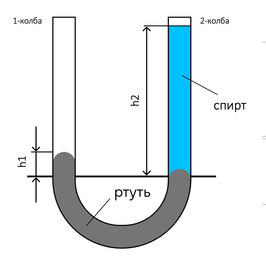 Закон сообщающихся сосудов показывает, что давления в таких сосудах с разными жидкостями равны друг к другу. Например, как показано на картинке, если налить в такой сосуд ртуть и спирт, то давление в первой колбе с ртутью равно давлению второй колбы со спиртом.
