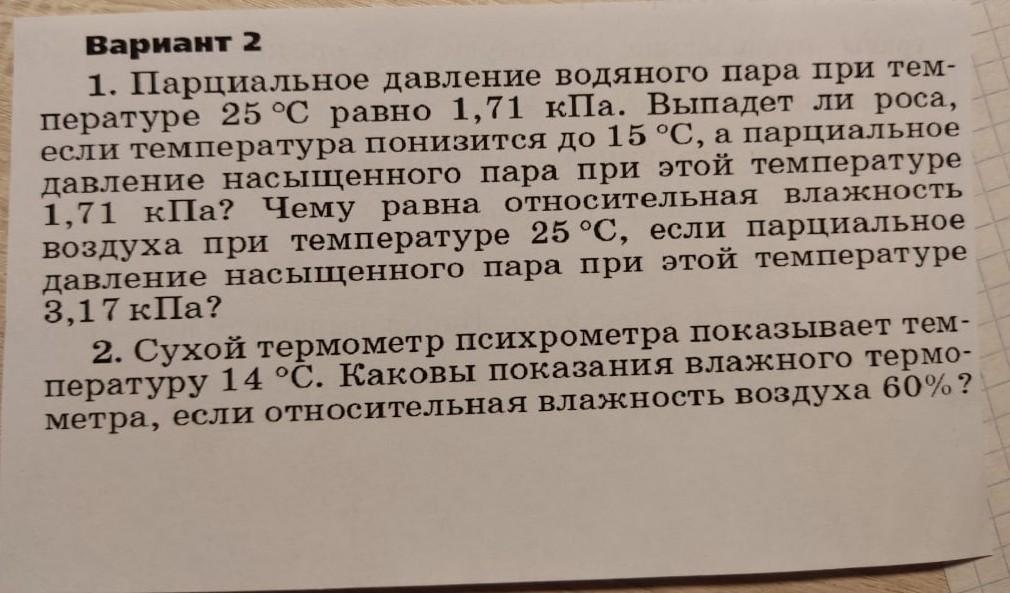Второе задание делается по психрометрической таблице. Так как показания сухого термометра равно 14 градусов, а относительная влажность воздуха равна 60%, то показания влажного термометра будет равно 4°с. Вроде все верно, перепроверьте.