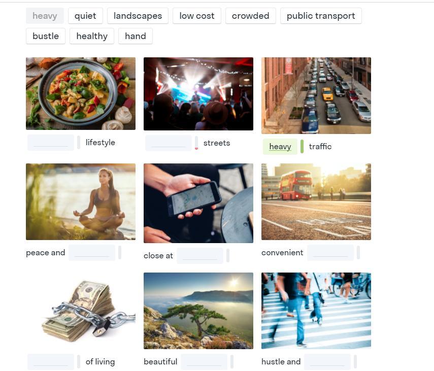 Healthy lifestyle, crowded streets, heavy traffic, peace and quiet, close at hand, convenient public transport, low cost living, beautiful landscapes, hustle and bustle.