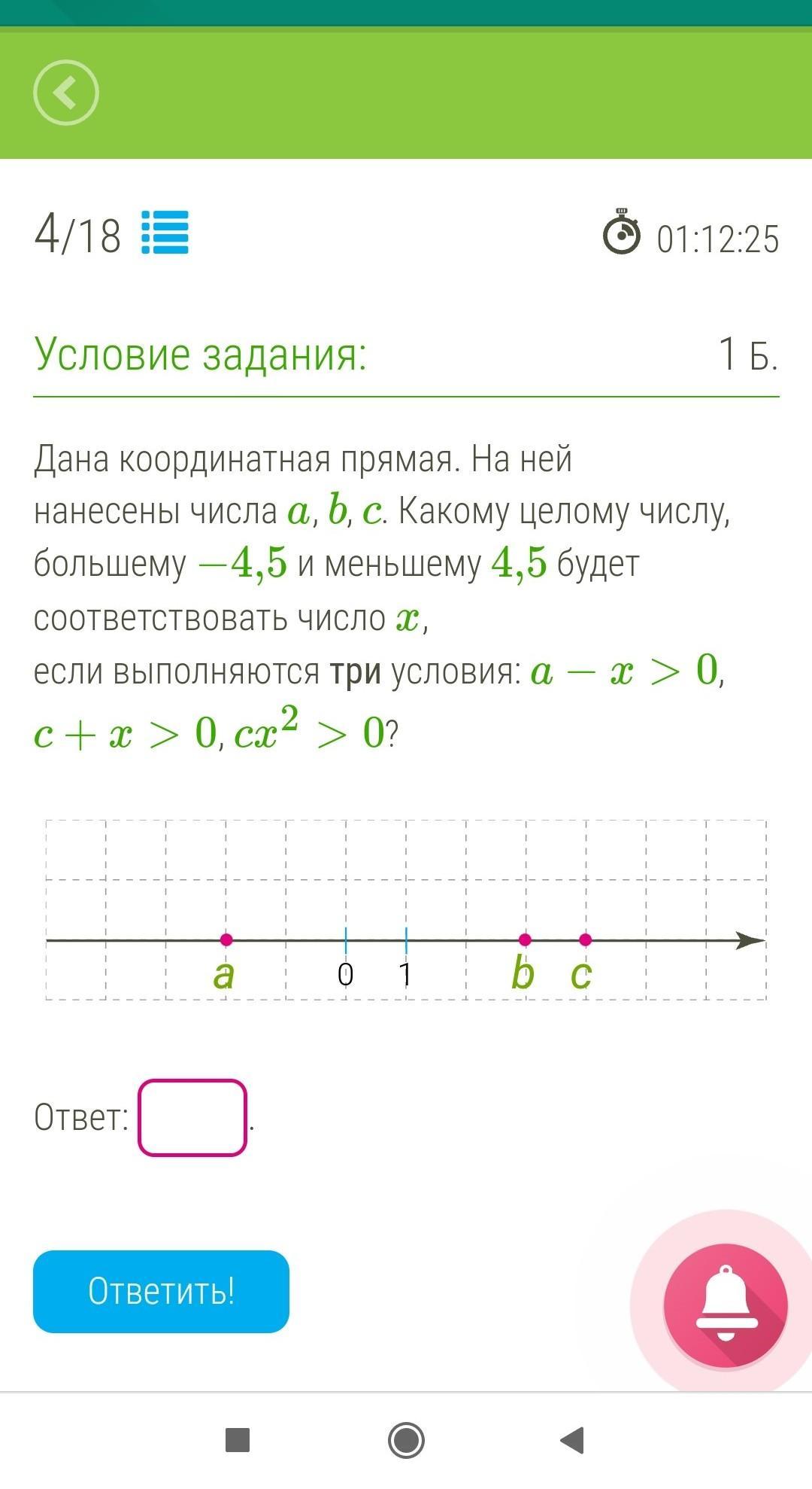 дана координатная прямая на ней нанесены числа a,b,с. Какому целому числу большему -4,5 и меньше 4,5 будет соответствовать число х, если выполняются 3 условия: а-х>0, с+х>0, сх²>0?