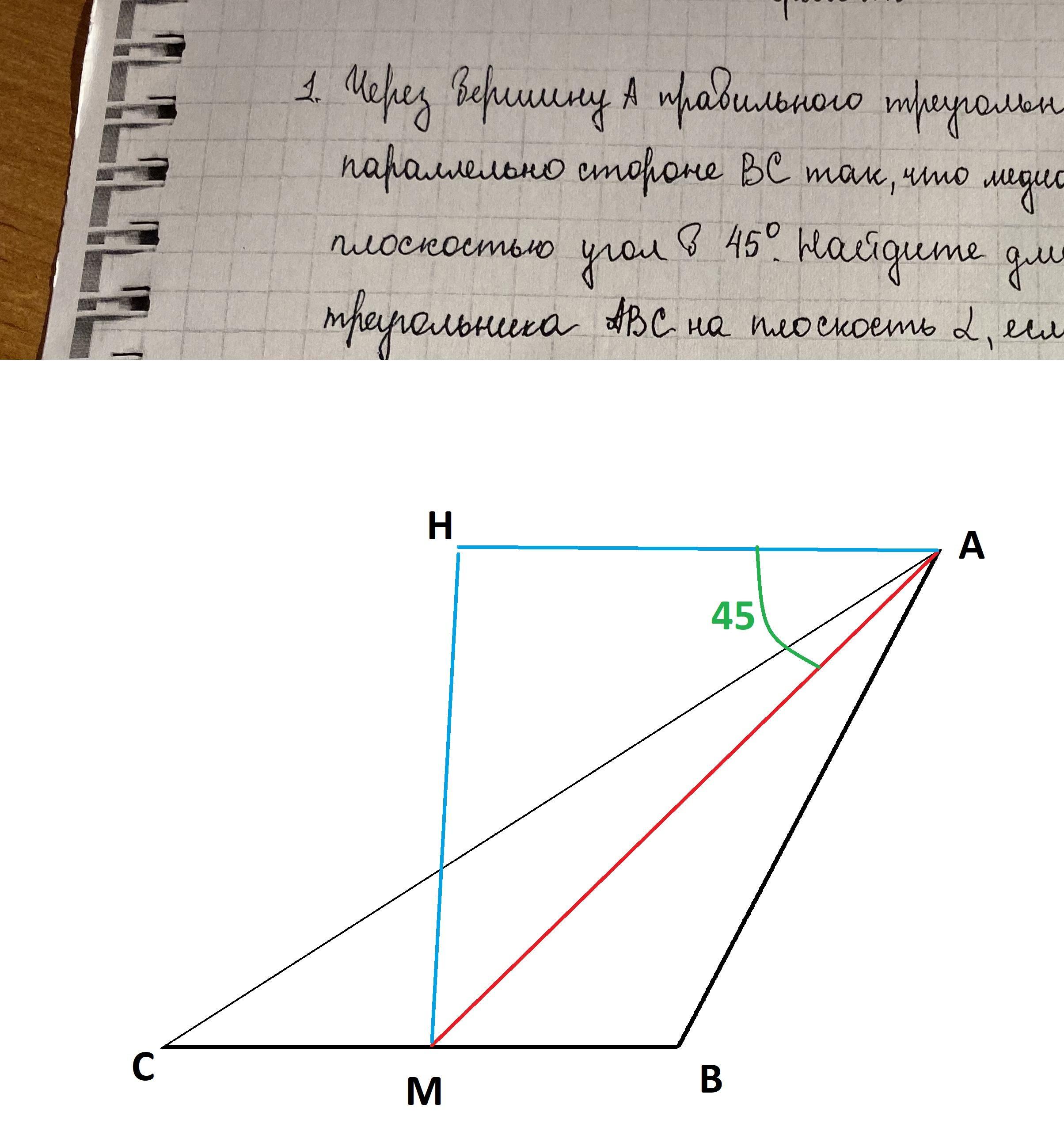 из ΔАМН; ∠МАН=45 , МН - перпендикуляр к плоскости, ( по условию АМ- проецируется на плоскость в АН, => ΔАМН-ПРЯМОУГОЛЬНЫЙ РАВНОБЕДРЕННЫЙ. МН=АН.