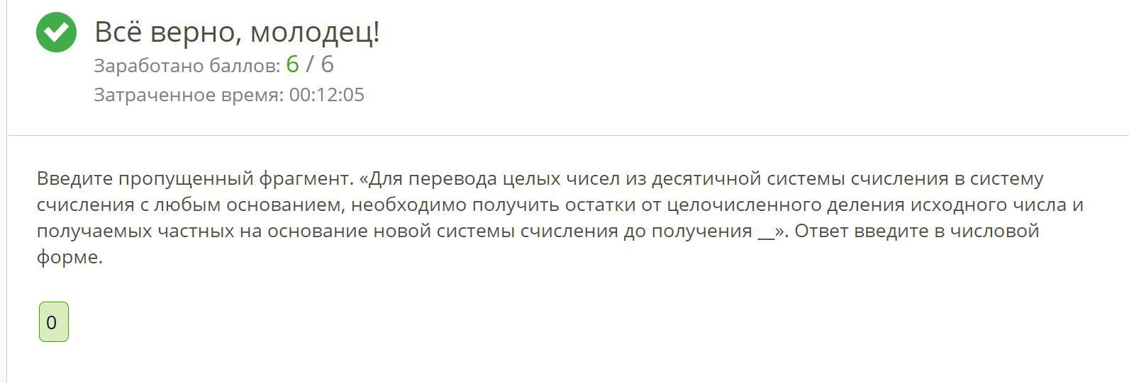 Введите пропущенный фрагмент. «Для перевода целых чисел из десятичной системы счисления в систему счисления с любым основанием, необходимо получить остатки от целочисленного деления исходного числа и получаемых частных на основание новой системы счисления до получения ». Ответ введите в числовой форме.