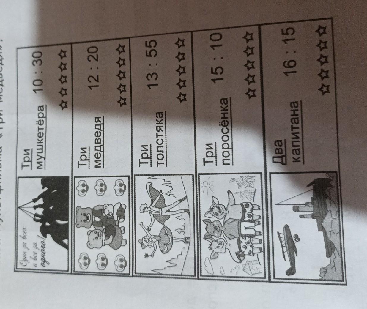 3) На афише представлено расписание сеансов кинотеатра на сегодня. После каждого сеанса в зале проводится уборка. Уборку нужно закончить за 10 минут до начала следующего сеанса. Известно, что мультфильм «Три медведя» состоит из двух частей, которые показывают без перерыва, а каж- дая часть длится 30 минут. Рассмотри расписание и ответы на вопрос: сколько времени будет у сотрудников на уборку зала после показа мультфильма «Три медведя»?