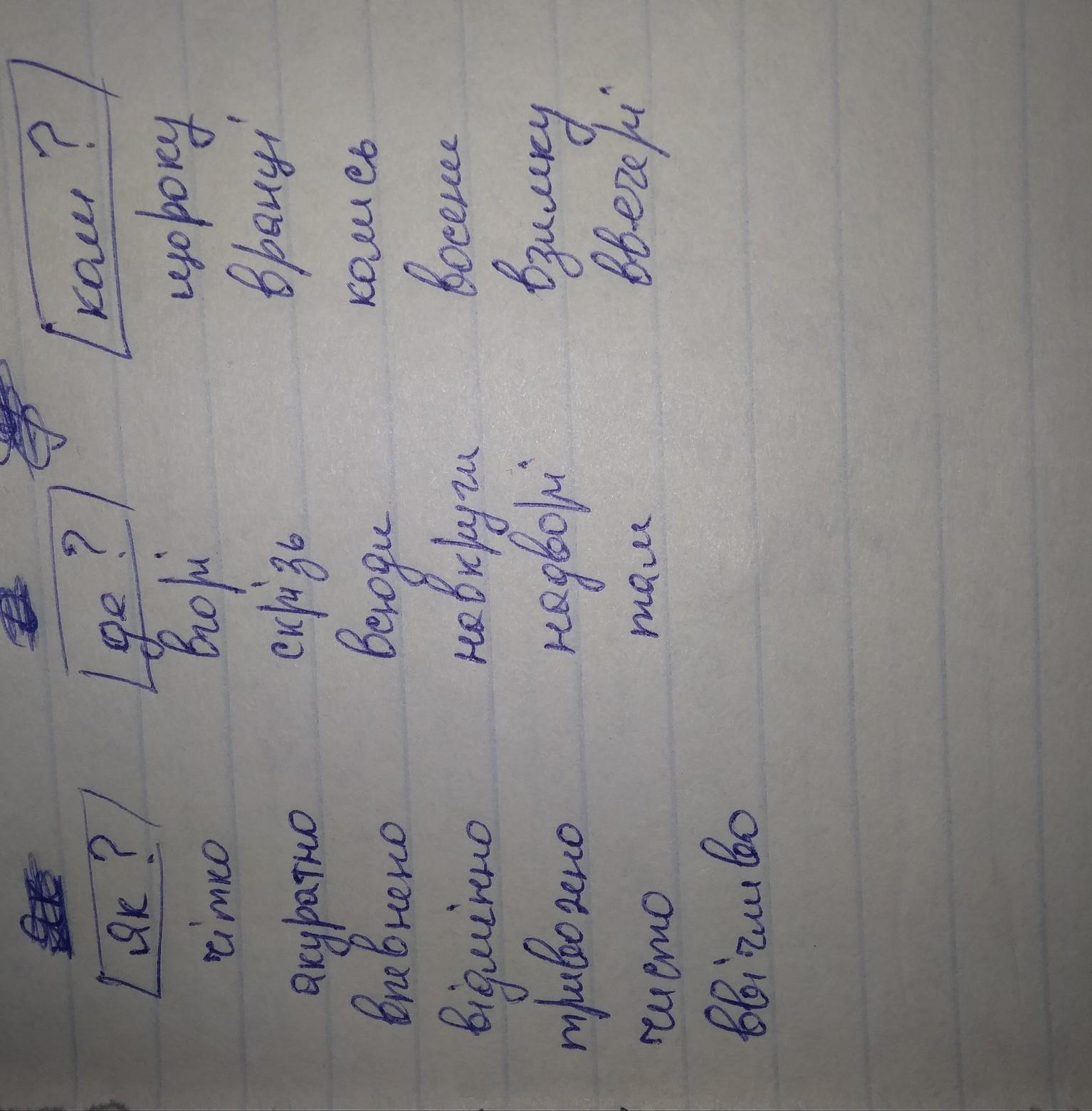 Прочитайте прислівники і запиши їх трьома колонками за питаннями як?де?коли?: