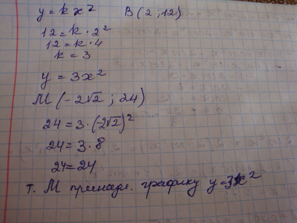 Известно,что график функции y=kx² проходит через точку B(2;12). Найдите значение коэффициента k. Принадлежит ли графику этой функции точка M(-2√2;24)?