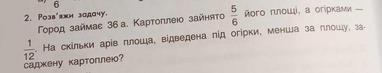 2. Розв'яжи задачу. 5 Город займає 36 а. Картоплею зайнято його площі, а огірками 6 1 На скільки арів площа, відведена під огірки, менша за плошу, за- 12 саджену картоплею?
