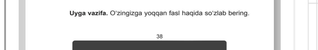 Mening sevimli mavsumim bahor. Daraxtlar gullay boshlaydi, qushlar uchadi, tabiat uyg'onadi.Quyosh yanada yorqinroq va iliqroq.Kunlar uzoqlashmoqda. Bahor juda chiroyli fasl.
