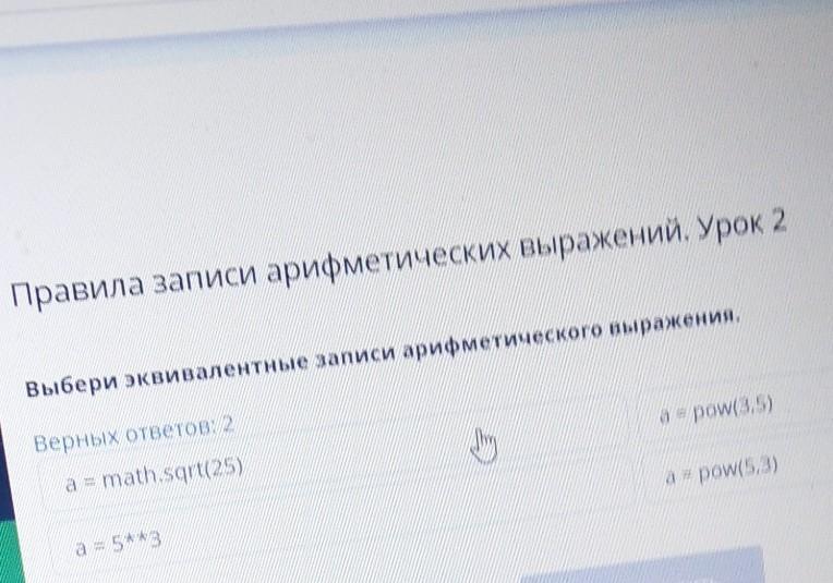 правила записи арифметических выражений. Урок 2 Выбери эквивалентные записи арифметического выражения. Верных ответов: 2 a = math.sqrt(25) a = pow(5,3) a = 5**3