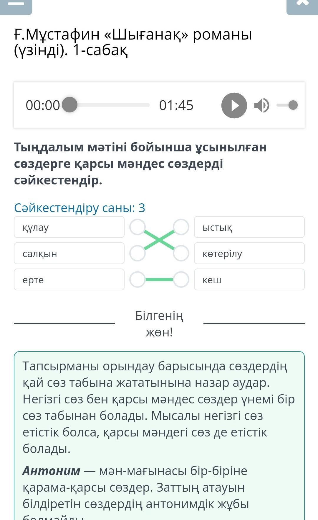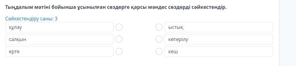 Тыңдалым мәтіні бойынша ұсынылған сөздерге қарсы мәндес сөздерді сәйкестендір.
