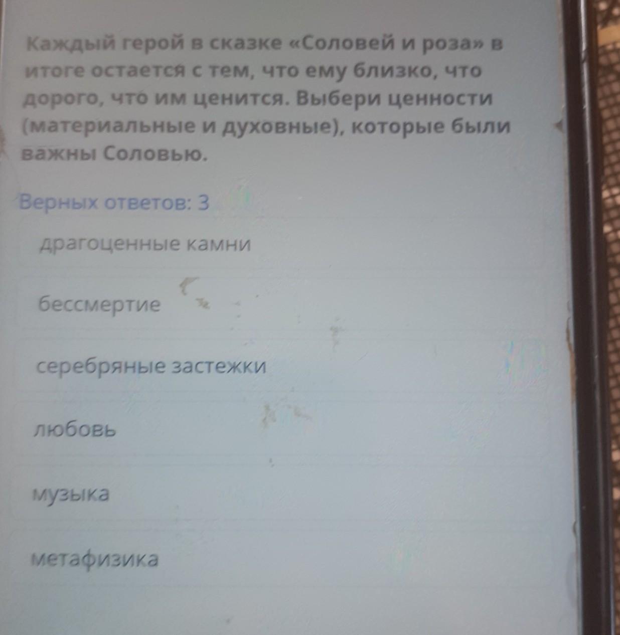 Каждый герой в сказке «Соловей и роза» в итоге остается с тем, что ему близко, что дорого, что им ценится. Выбери ценности (материальные и духовные), которые были важны Соловью. Верных ответов. З музыка серебряные застежки метафизика драгоценные камни бессмертие любовь