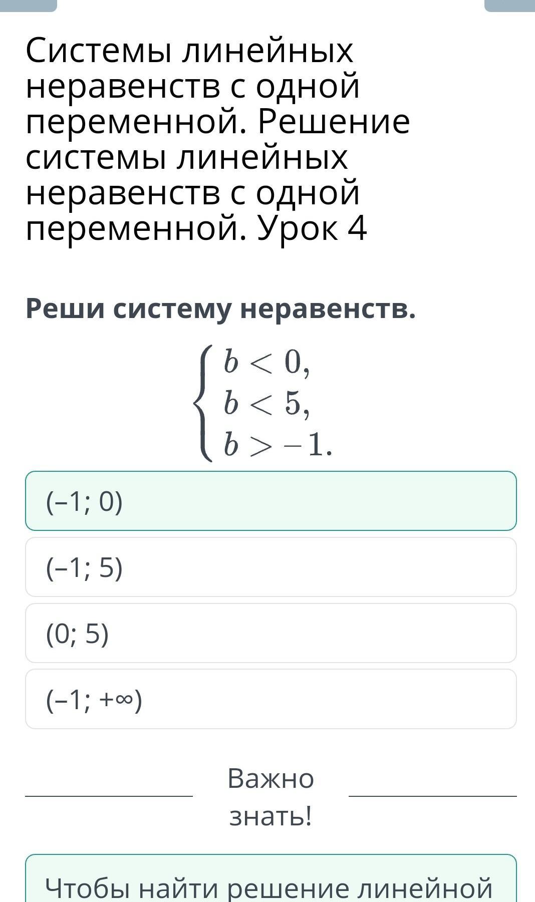 Системы линейных неравенств с одной переменной. Решение системы линейных неравенств с одной переменной. Урок 4 Реши систему неравенств. (–1; 5) (0; 5) (–1; +∞) (–1; 0) все на картинки помогите пожалуйста онлайн мектеп по математике.