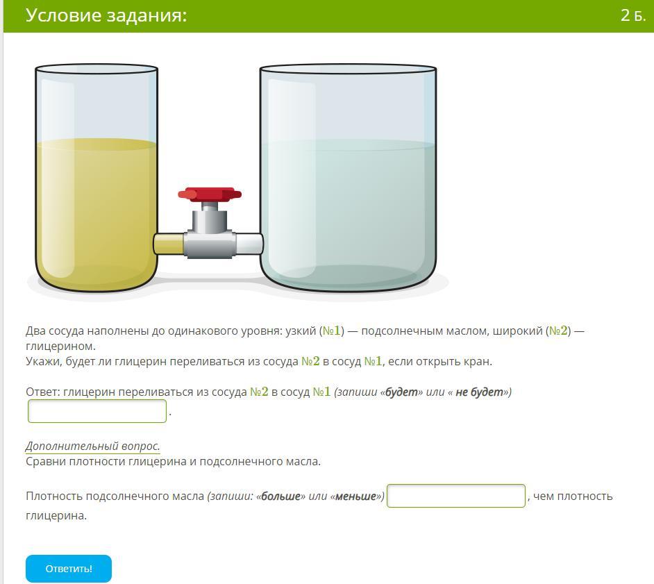 Глицерин будет переливаться до тех пор, пока давление не станет одинаковым в обоих сосудах.